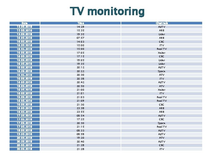 TV monitoring Date 15. 05. 2018 16. 05. 2018 16. 05. 2018 17. 05. 2018 18. 05. 2018 19. 05. 2018 20. 05. 2018 Time 14: 29 15: 35 19: 35 07: 57 14: 03 15: 00 17: 05 17: 15 19: 05 19: 35 20: 12 20: 22 20: 30 20: 38 20: 42 20: 50 21: 01 21: 03 21: 09 21: 30 23: 38 23: 55 08: 54 17: 25 20: 30 21: 15 08: 33 08: 58 19: 20 20: 40 21: 28 Channels Az. TV ARB Lider ARB CBC ITV Real TV Xezer CBC Lider Az. TV Space ATV ITV Az. TV ATV Xezer ITV Real TV CBC ARB Az. TV CBC Space Real TV Az. TV CBC ITV