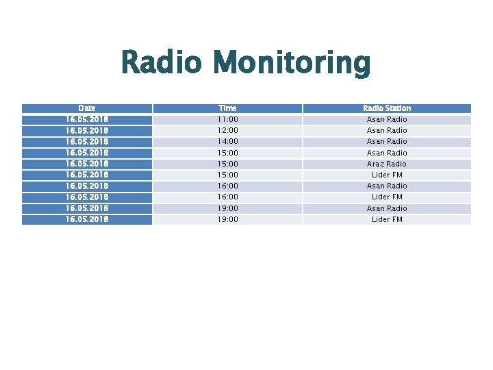 Radio Monitoring Date 16. 05. 2018 16. 05. 2018 Time 11: 00 12: 00 14: 00 15: 00 16: 00 19: 00 Radio Station Asan Radio Araz Radio Lider FM Asan Radio Lider FM