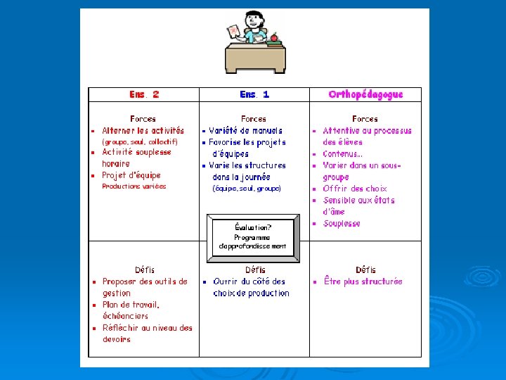 Conditions gagnantes pour notre démarche de DP Durée d’expé rimenta l’utilisa tion su tion du ffi référe person ntiel et sante pour nalisés des ou. tils la e d e un et m r e m l l i o a c v Vision tence à tra é comp oncertée. c action Volonté de changer les choses. Con influ viction élèv ence s d’avo ir u es e ur l ne ’ é n d v o lu iffic ulté tion d. es tion des n e v r te n ’i d n ans un pla d r ie r to r e p é ide d’une R ’a l à , s e lé ib aires c e, selon u iq actions priorit m té s y s e gnostiqu évaluation dia articuliers. p s in o s e b s le