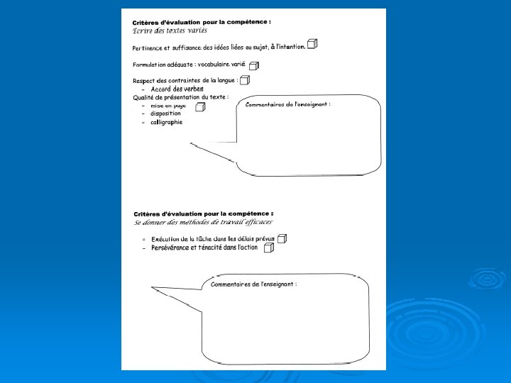 Savoirs: Savoirs essentiels, stratégies… Attitudes: Estime de soi, motivation… Démarches: Manière d’apprendre Métacognition: Analyse, réflexion Compétences disciplinaires & transversales Méthodes, techniques Attitudes Valeurs Temps offert Matériel disponible Aménagement de la classe Support visuel