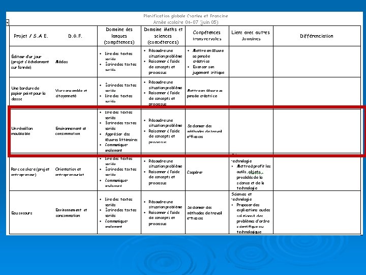 Phase que nous jugeons préalable : INFORMATION Mai 2005 –Juin 2006 APPROPRIATION • Apprendre à mieux connaître les élèves (styles d’apprentissage); • Apprendre à se connaître comme enseignant (styles d’apprentissage, approches, forces et limites); • Apprivoiser le programme de formation; • Comprendre ce qu’est une compétence (Se donner des méthodes de travail efficaces); • Différencier au niveau de l’ensemble du groupe; • Collaborer avec l’orthopédagogue à titre d’experte. Sept 2006 –Juin 2007: INTÉGRATION • S’interroger sur nos compétences professionnelles à développer; • Poursuivre notre compréhension des compétences (Résoudre des situations -problèmes, Écrire des textes variés); • Différencier au niveau de sous-groupes d’élèves en partenariat avec l’orthopédagogue. Sept 2007 à ce jour: PERSONNALISATION • Dissolution de l’équipe (changement de niveau, d’école, nouvelle affectation) • Création de nouvelles démarches de différenciation pédagogique inédites de façon autonome.