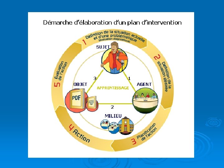 SUJET Élève Sous-groupe d’élèves Groupe d’élèves OBJET Programme de formation Compétences disciplinaires et transversales Modèle de la situation pédagogique AGENT Enseignant Équipe-cycle Orthopédagogue Formules pédagogiques MILIEU Temps (horaire) Aménagement de la classe Ressources matérielles Ressources humaines Guay (2006) d’après Legendre (2005)