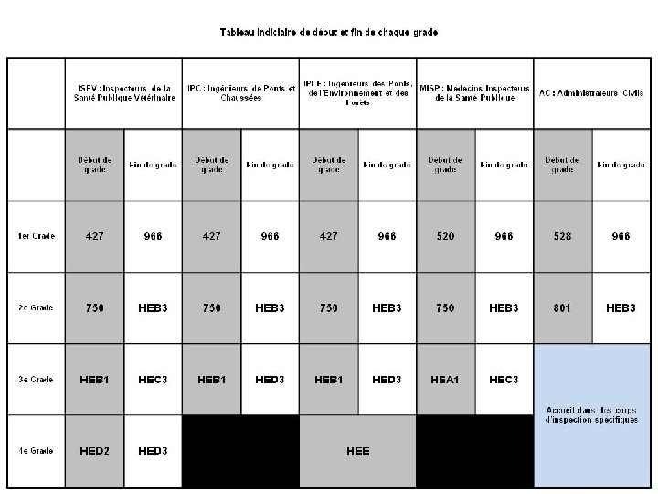 Les professions médicales au sein de l’Etat : le « décrochement » IAE! Tableau indiciaire de début et fin de chaque grade ISPV : Inspecteurs de la Santé Publique Vétérinaire IAE : Ingénieurs de l'Agriculture et de MPCV: Médecins pharmaciens chimistes Médecins et pharmaciens inspecteurs vétérinaires biologistes des armées l'Environnement Début de grade Fin de grade 1 er Grade 427 966 379 801 466 735 520 966 2 e Grade 750 HEB 3 593 966 735 835 750 HEB 3 3 e Grade HEB 1 HEC 3 835 HEA 3 HEA 1 HEC 3 4 e Grade HED 2 HED 3 HEB 1 HED 3