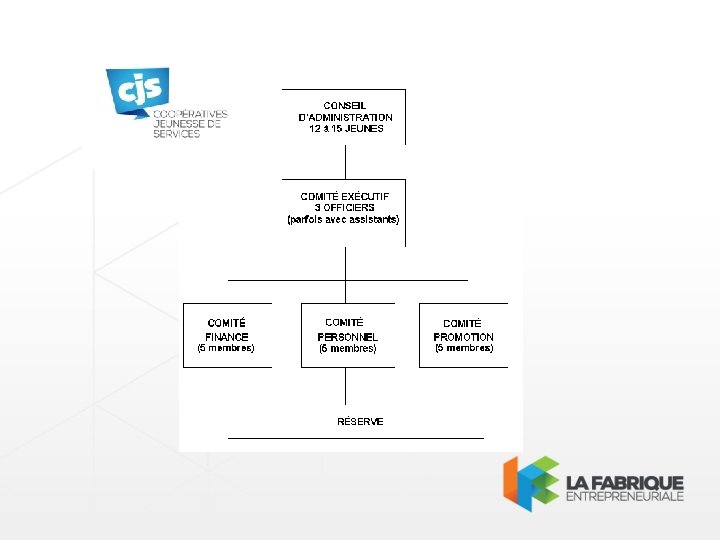 FACTEURS DE RÉUSSITE D’UNE CJS • Gain d’autonomie du groupe de coopérants : – Acquisition collective d’autonomie dans les 3 sphères de la CJS soit; la vie d’entreprise, la vie associative et le travail. • Développement de la culture entrepreneuriale du coopérant : – Développer le potentiel entrepreneurial des coopérants. – La créativité, l’autonomie, le sens des responsabilités, le leadership et la solidarité. • Mise en place des moyens pour atteindre les objectifs collectifs : – Les coopérants se fixeront des objectifs en tant qu’entreprise – Évaluer l’atteinte des objectifs non seulement par leur résultat, mais également par les moyens que les coopérants ont utilisés pour y arriver. • Conscience de participer à un projet d’entrepreneuriat coopératif: – Les coopérants se considèrent comme des entrepreneurs coopératifs. – Prise de conscience que le projet CJS est une coopérative de travail