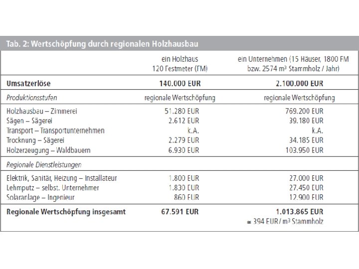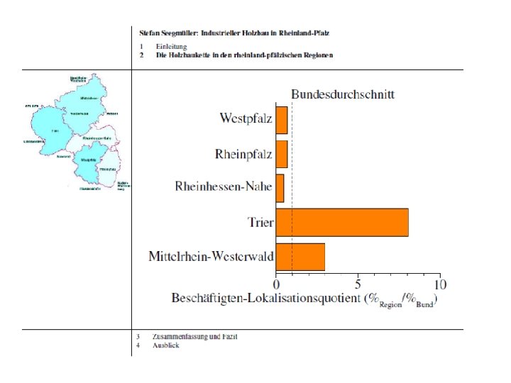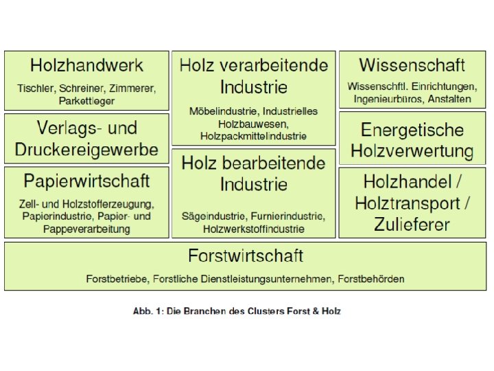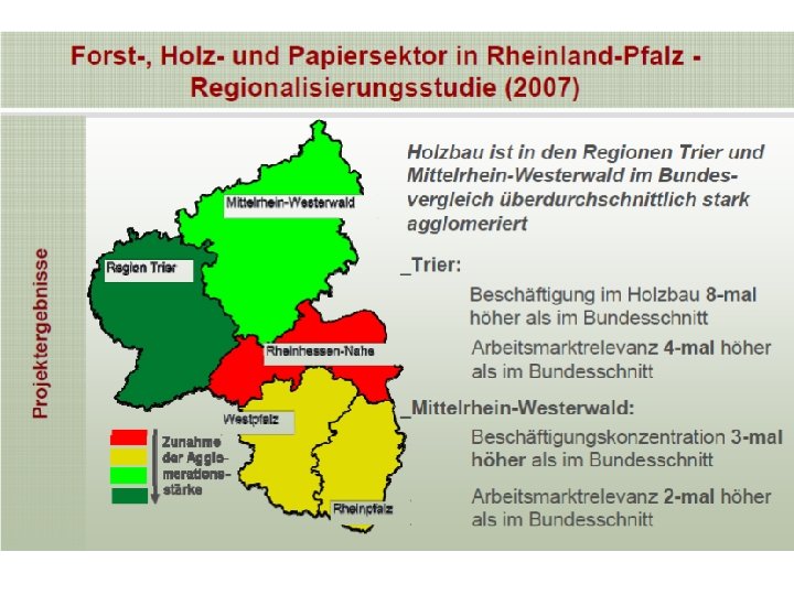 Kernaussagen für Rheinland-Pfalz • 42% Waldanteil • Platz 2 im verarbeitenden Gewerbe bie Beschäftigung, Platz 3 bei Wertschöpfung • 20 Beschäftigte pro 1000 m³ (10 mal mehr als in Schweden) • Mehr als 3000 Euro Wertschöpfung je Fm • 8400 Unternehmen, 8, 4 Mrd. Umsatz, 50000 Beschäftigte