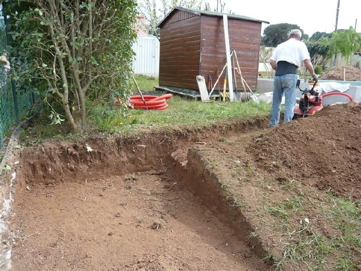 04 avril 2014 – La fondation (plate) du local est terminé. Yann commence la tranchée pour les tuyaux.