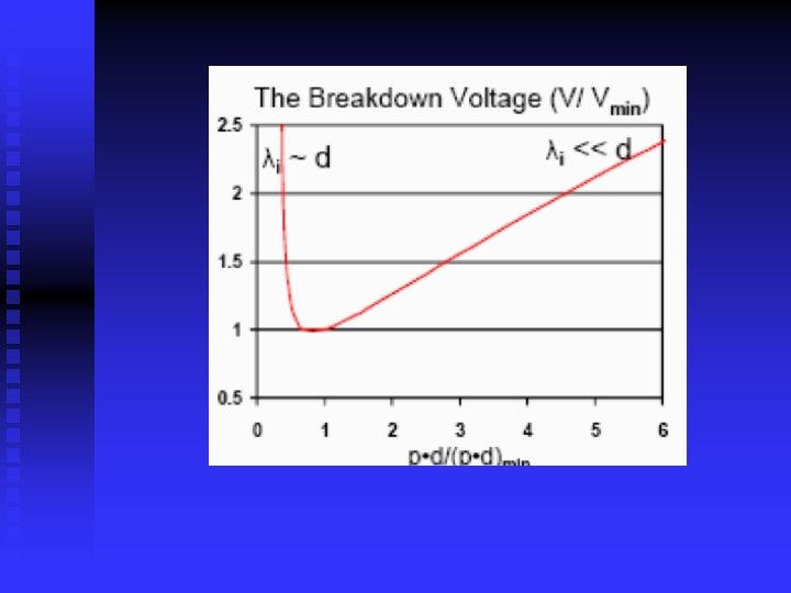 Paschenov zákon – Paschenova krivka n n Napätie pri ktorom sa zapáli samostatný el. výboj v danom plyne závisí len na pomere medzielektródovej vzdialenosti d a voľnej dráhy λi, ktorú potrebuje elektrón na ionizáciu molekuly nárazom, číže d/ λi. Keďže v danom plyne je λ. Keďže v danom plyne je i nepriamo úmerná tlaku plynu p ((hustote N) je zápalné napätie samostatného výboja funkciou p. d (N. d). Ani príliš veľké, ani príliš male p. d nie sú vhodné pre účinnú ionizáciu, t. j, spôsobujú zvýšenie zápalného napätia. Preto pre daný plyn existuje optimálne (p. d)min, kde je zápalné napätie minimálne: