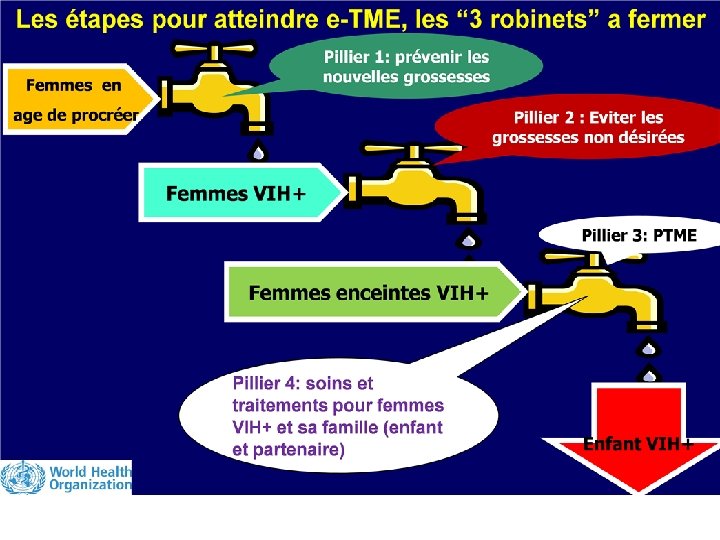 Assurer une approche globale de la PTME 1. Prévention primaire de l’infection par le VIH 2. Prévention de grossesses non désirées chez la femme infectée par le VIH 3. Prévention de la transmission du VIH des femmes infectées à leurs enfants 4. Traitement, soins et soutien de la femme infectée par le VIH et de sa famille Associations communautaires Equipe soignante Associations de Pv. VIH