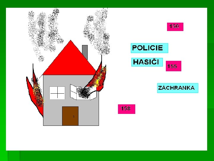 § Vyvození telefonní čísel 150, 155, 158 § na tabuli je nakreslený obrázek hořícího domu, vedle něj jsou magnetem připevněné cedulky „policie“, „záchranka“, „hasiči“, “ 155“, „ 158“ a „ 150“ § úkolem dětí je seřadit logicky kartičky podle toho, které složky záchranného systému jsou na místě potřeba nejdříve a k nim přiřadit telefonní čísla § z toho si mohou vyvodit pomůcku pro zapamatování – nejdříve přijedou hasiči dům uhasit (nejnižší číslo 150), poté je třeba ošetřit zraněné (155) a až na závěr vše vyšetřuje policie (nejvyšší číslo 158)