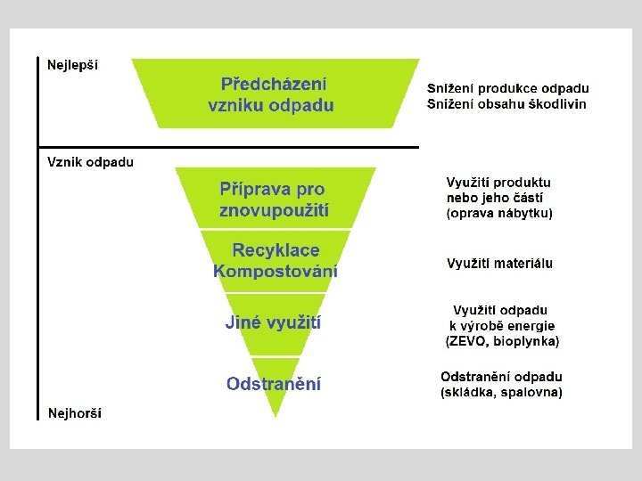 Hierarchie odpadového hospodářství § 9 a 1) předcházení vzniku odpadů 2) příprava k opětovnému použití 3) recyklace odpadů 4) jiné využití odpadů, například energetické využití 5) odstranění odpadů § odpadové hospodářství § = činnosti směřující k předcházení vzniku odpadu , k nakládání s nimi § až po jejich využití či odstranění, včetně péče o zařízení, která slouží k nakládání s nimi