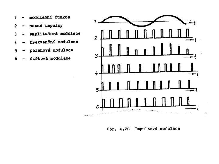 Shenonova věta definuje propustnost kanálu pro bílý šum C= Df *log 2 [(P+N)/N] P. . je střední výkon signálu N. . je střední výkon šumu Df je šíře pásma propustnosti kanálu Přenos signálu Modulace Modulací rozumíme časovou změnu jednho z parametrů, tj. veličin charakterizujících fyzikální pochod nesoucí informaci. Nejčastěji to bývá změna výkonu přenášeného vlněním.