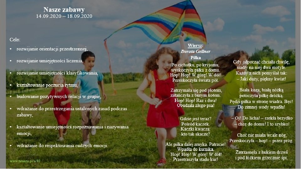 Przedszkole moim drugim domem 01. 09. 2020 – 04. 09. 2020 Cele: • budowanie świadomości przynależności do grupy przedszkolnej • zapoznanie z rozkładem pomieszczeń w przedszkolu • wdrażanie do przestrzegania ustalonych reguł i zasad obowiązujących podczas pobytu w przedszkolu • wdrażanie do uważnego słuchania • wdrażanie do uczestnictwa w zabawach integracyjnych, ruchowych i muzycznych • wdrażanie do bezpiecznego i poprawnego wykonywania ćwiczeń gimnastycznych Opowiadanie (fragment): Elżbieta Ostrowska Nocne kłopoty zabawek Doroty […] Czy wszyscy tu śpią? […] Nagle. . . Co to? . . . W ciszy rozległ się jakiś stuk, a po chwili ktoś zawołał słabym głosikiem: – Podnieś mnie, Dorotko! Tak mnie noga boli! Słyszysz? . . . Dorotko. Księżycowe płomyki przesunęły się ciekawie i przysiadły przy leżącej na podłodze ulubionej lalce Dorotki – Małgorzatce. – Cicho! Obudziłaś mnie, Małgorzatko! – powiedział siedzący w pobliżu Murzynek. – Co ci się stało? – Bambo! Chodź tu, Bambo! Spadłam z łóżka Dorotki! Ojej!. . . Moja noga! – żałośnie skarżyła się lala. – O!. . . – szepnął zmartwiony Murzynek. – Pomóż mi, Bambo – prosiła z płaczem Małgorzatka. – Zawołaj Doktora. . . Murzynek wstał i podbiegł do lali. – Zaraz po niego pójdę, tylko powiedz, gdzie go szukać? – Wczoraj Dorotka pokazywała mi Doktora – mówiła cicho lala. – A wiesz, gdzie on mieszka? – Widziałam go na obrazku, w książce dla dzieci. […] Murzynek ostrożnie podtrzymywał lalę, która z trudem posuwała się naprzód. Szli powoli, krok za krokiem. – Już niedaleko. . . – szepnął Bambo. – Zaraz dojdziemy […]