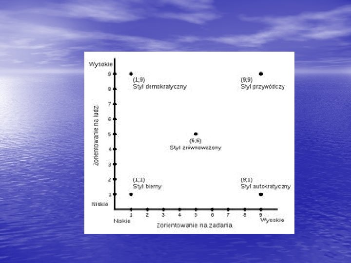 Koncepcje przywództwa • Styl 9. 1. - stanowi on przeciwieństwo poprzedniego, bowiem tu pracownicy nie są traktowani jak ludzie, ale jak "żywe maszyny": cała uwaga menedżera skierowana jest wyłącznie na wydajność pracy jego podwładnych, którym nie pozostawia się żadnej swobody działania (styl ten nazywa się stylem "autokratycznym"). • Styl 9. 9. - zapewnia on zarówno maksimum produktywności, jak i pełne zrozumienie pracowników: innymi słowy praktykujący ten styl menedżer troszczy się nie tylko o normy produkcyjne, ale dba także o stworzenie atmosfery sprzyjającej komunikacji międzyludzkiej.