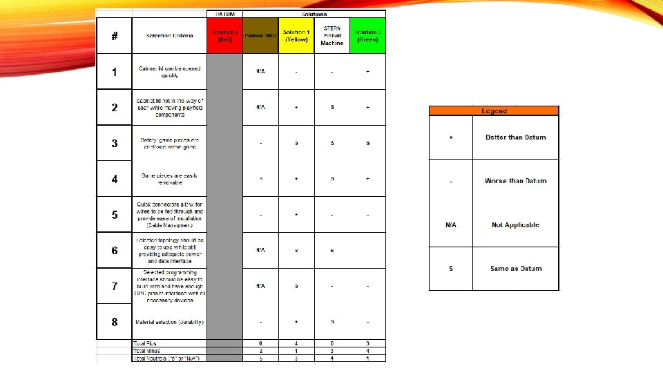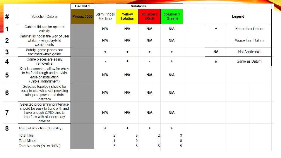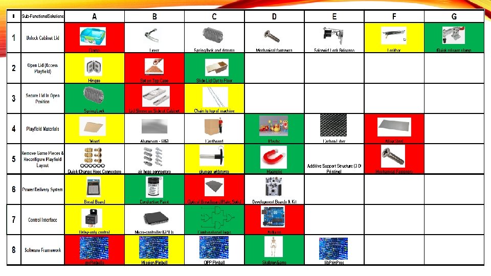 PRELIMINARY DESIGN SELECTIONS Lid latching mechanism Clamp Lid opening/closing Top hinges Game piece interchangeability Custom socket with plungers/detents Software framework Mission Pinball Play surface material Wood Lid Material Plexiglass