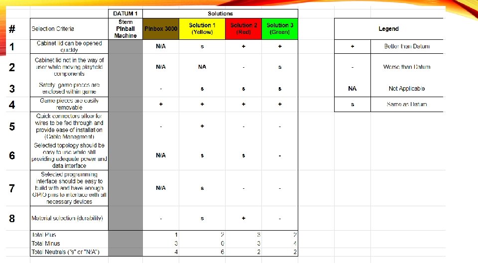 BACKGROUND ERs and CRs have been refined, here’s what’s changed: ● Team has shifted focus away from game play-time and difficulty ● Priority has been lowered for comprehensive user manual at this time We’ve reached out to George Gomez and have been put in contact with Orin Day who recommended visiting Silverball Saloon As a result of the problem definition review we are focusing less on final game experience and more about creating a mechanically and electrically functional pinball framework.