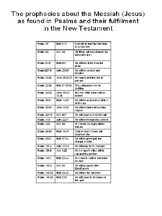 Psalm 2: 7 Matt 3: 17 God will declare the Messiah to be his Son Psalm 8: 6 Heb 2: 8 All things will be put under the Messiah’s feet. Psalm 16: 10 Mark: 6 -7 He will be raised from the dead Psalm 22: 7 -8 Luke 23: 35 He will be mocked and insulted. Psalm 22: 16 John 20: 25, 27 His hands and feet will be pierced Psalm 22: 18 Matt 27: 35 -36 They will gamble for his clothing Psalm 34: 20 John 19: 3233, 36 Not one of his bones will be broken Psalm 35: 11 Mark 14: 57 He will be accused by ruthless witnesses Psalm 35: 19 John 15: 25 He will be hated without any reason Psalm 40: 7 -8 Heb 10: 7 He will come to do God’s will Psalm 41: 9 Luke 22: 47 He will be betrayed by a friend Psalm 45: 6 Heb 1: 8 His throne (or reign) will be forever Psalm 68: 18 Mark 16: 19 Zeal for God’s house will consume him Psalm 69: 21 Matt 27: 34 He will be given gall and vinegar to drink. Psalm 109: 4 Luke 23: 34 He will pray for his enemies Psalm 109: 8 Acts 1: 20 His betrayer’s office will be replaced by another Psalm 110: 1 Matt 22: 44 His enemies will be put under his feet. Psalm 110: 4 Heb 5: 6 He will be a priest like Melchizedek Psalm 118: 22 Matt 21: 42 He will be the capstone Psalm 118: 26 Matt 21: 9 He will come in the name of the Lord