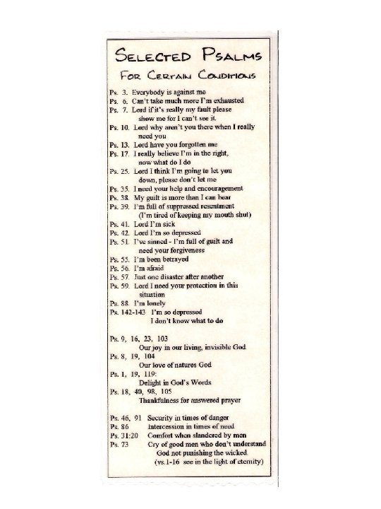 Psalms for all Occasions • Talk to the children about their week and pray about any concerns. • This term our program is called Psalms and we will be talking about the different types of Psalms There is a Psalm to match almost every mood feeling or need we have • Read Selected Psalms for Certain Conditions • Read Psalm 23 • Discuss • Work on the worksheets Make Psalms bookmarks • Get into a circle and pray for the coming week.