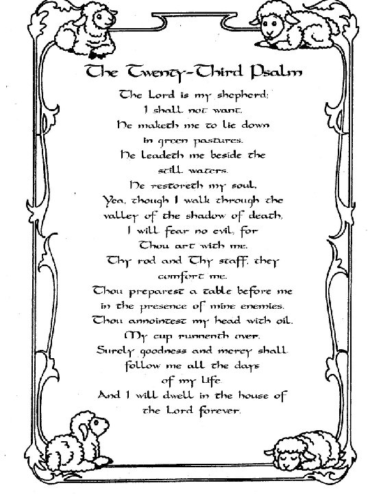 Psalm 23 • A Psalm of David. • 1 The LORD is my shepherd; I shall not want. 2 He makes me to lie down in green pastures; He leads me beside the still waters. 3 He restores my soul; He leads me in the paths of righteousness For His name’s sake. 4 Yea, though I walk through the valley of the shadow of death, I will fear no evil; For You are with me; Your rod and Your staff, they comfort me. 5 You prepare a table before me in the presence of my enemies; You anoint my head with oil; My cup runs over. 6 Surely goodness and mercy shall follow me All the days of my life; And I will dwell[a] in the house of the LORD Forever.