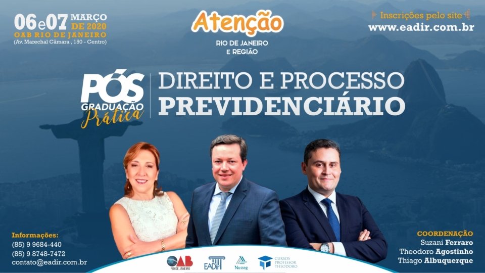 9. Gestão de Escritório de Advocacia, INSS digital, Meu INSS e Pratica Administrativa Previdenciária; 10. Peticionamentos e Recursos Previdenciários, Pratica de Audiência e Juizados Especiais Federais; 11. Regimes Próprios de Previdência Social e os Efeitos da Reforma da Previdência; 12. Contribuições para a Seguridade Social; Salário-de-Contribuição; Contribuição das Empresas e dos Segurados; 13. Relações entre o Direito Previdenciário e o Direito do Trabalho e Acidente do Trabalho e Responsabilidade Civil do Empregador; 14. Previdência complementar: aberta e fechada; 15. Regras Específicas Sobre o Procedimento Previdenciário dos Juizados Especiais Federais;