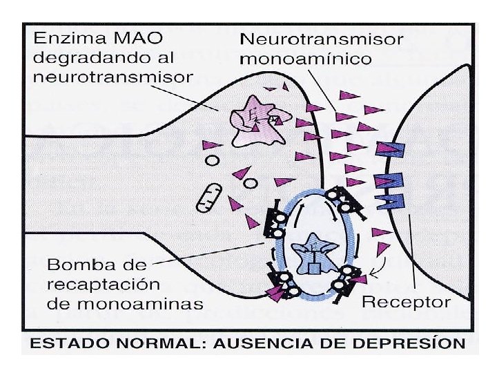 IMAO (1957: Iproniazida) • Efecto primario: aumento de monoaminas por inhibición del metabolismo. • 2 enzimas: IMAO A: inhibe degradación 5 HT y NA. IMAO B: inhibe degradación de Dopa. • Tipos: IMAO A reversibles: Moclobemida: 150 -600 IMAO B reversibles: Seleginina: 300 mg/d: no selectivo sobre IMAO B. IMAO A y B irreversibles: Tranilcipromina: 10 -30 mg/d. Fenelzina: 90 mg/d. Nota: degradación de la IMAO: 2 -3 semanas.