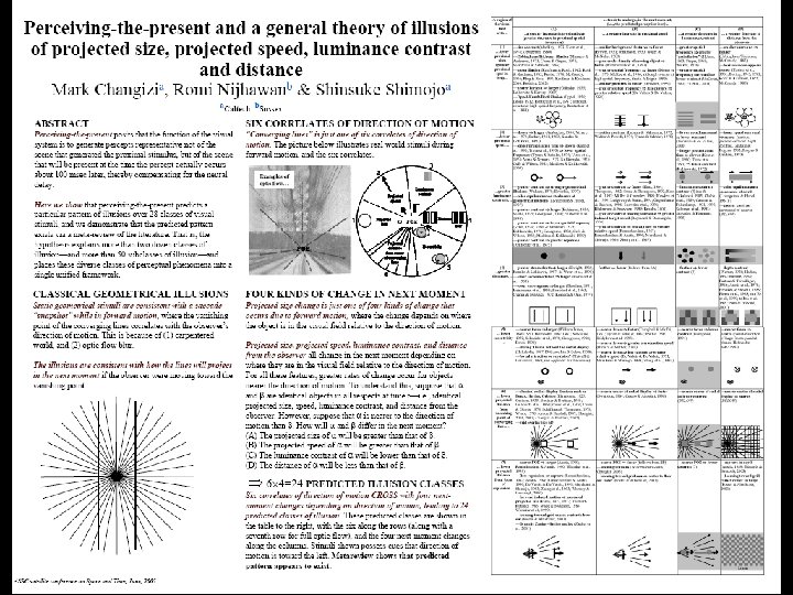 Changizi Percepción anticipatoria • Perceiving-the-present is theoretical framework positing that the function of the visual system is to generate percepts representative not of the scene that generated the proximal stimulus, but of the scene that will be present at the time the percept actually occurs about 100 msec later, thereby compensating for the neural delay. To achieve this, the visual system must utilize ecological regularities to "guess" what is about to happen in the next moment. One of the most common kinds of ecological regularity is forward movement, and this research demonstrates that the visual system responds with appropriate latency-correction mechanisms when cues suggest forward movement.