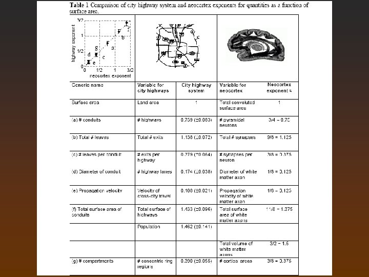 Changizi Ley de potencia en ciudades y cerebros • • Cities and the mammalian neocortex may seem to have little in common, but each is approximately a surface with a network of conduits (roads and neurons, respectively) connecting its disparate parts. Because both cities and brains are under selection pressures to make their connections efficiently, we investigate the hypothesis that the organization of city highway networks and the mammalian neocortex may be governed by common principles. Here we measure how city highway networks vary with city size and find that, consistent with the hypothesis, highway networks scale with exponents nearly identical to those found for the analogous quantities in the neocortex. As a function of surface area, the number of conduits scales approximately as the 3/4 power, the number of "leaves" (highway exits and synapses) scales approximately as the 9/8 power, propagation velocity scales approximately as the 1/8 power, and total conduit surface area scales approximately as the 11/8 power. We also find that city population scales as the 1. 46 power of surface area, potentially driven by the total surface area of highways. We discuss the extent to which explanations for neocortical scaling can be extended to cities.