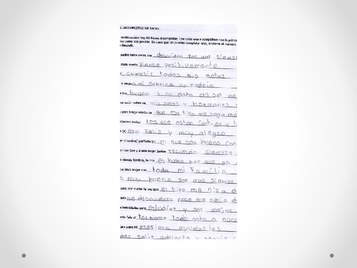 Test de Sacks de frases incompletas Esta prueba nos permite obtener un panorama general de la situación emocional del sujeto en diferentes áreas, como la familiar, social, motivacional, etc.