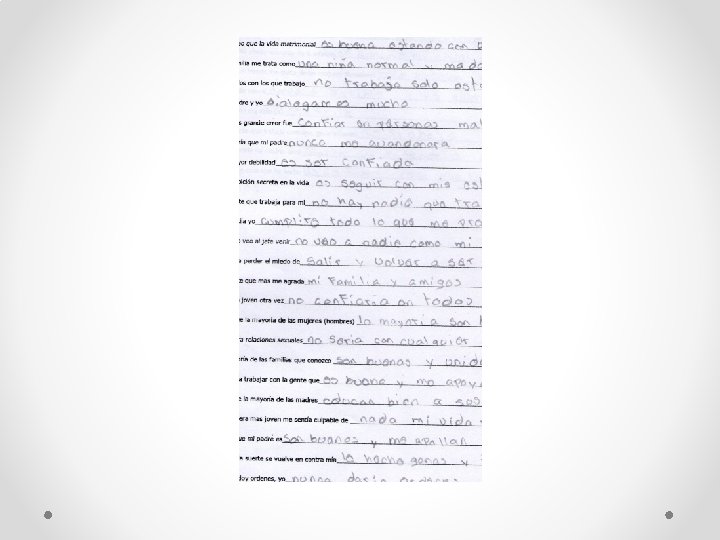En lo que se refiere a los resultados de esta prueba, se observa que la menor presenta alteraciones en el área perceptivo motriz. En cuanto a los indicadores emocionales se manifiestan actitudes evasivas, producto de un yo inestable; por otra parte muestra inmadurez emocional e infantilismo. También se observa ansiedad despertada por estímulos afectivos (necesidad de llamar la atención), muestra defensas yoicas pobres. La figura materna se presenta como fálica, existe falta de control de impulsos afectivos producida por controles internos débiles. Es digno de notar la falta de control de impulsos sexuales, así como la negación de los cambios sexuales (rasgo común en adolescentes).