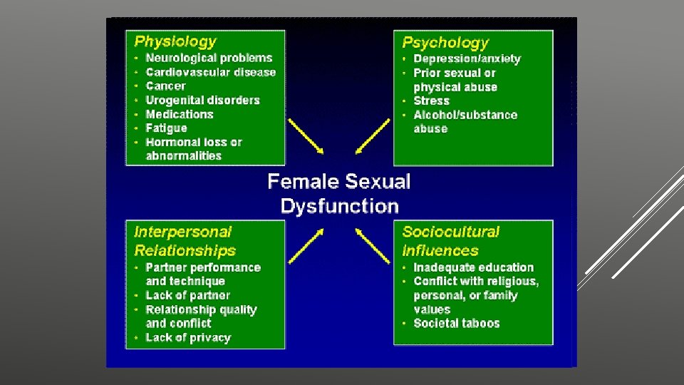 SINDROME POST-ISTERECTOMIA • La sintomatologia è in ogni caso estremamente variabile da donna; i disturbi si manifestano secondo combinazioni diverse per natura, numero, intensità e durata. • Le modificazioni neuroendocrine conseguenti all’intervento sono tra i principali fattori eziopatogenetici (Richards, 1974). • La variabilità interindividuale nel vissuto cognitivo ed emotivo e nella sintomatologia lamentata è riconducibile anche all’influenza di variabili individuali e ambientali, di natura psicologica e socioculturale. • Somiglianze con la Sindrome Premenopausale in riferimento alla natura dei disturbi e alle variabili coinvolte nell’insorgenza e mantenimento degli stessi, soprattutto in caso di isterectomia con ovariectomia (menopausa chirurgica).