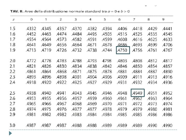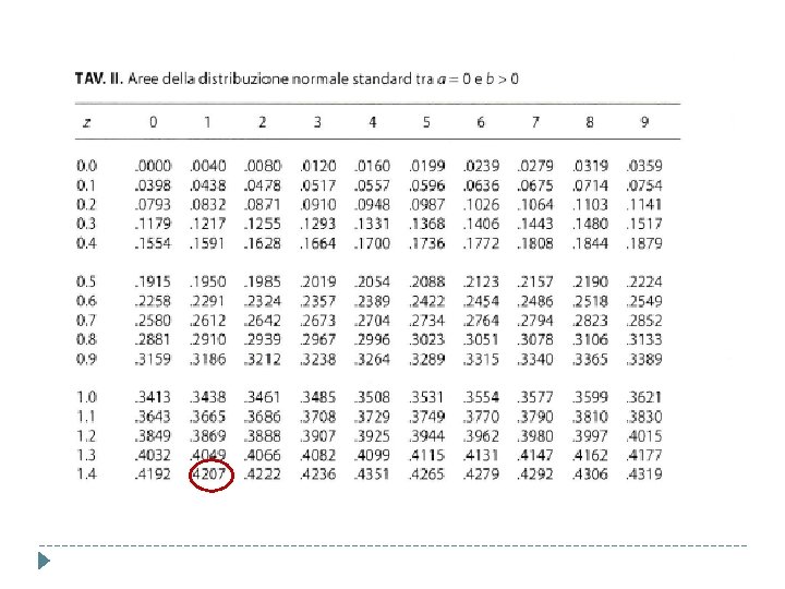 La taratura: Dati normativi di un test psicologico Punteggi grezzi Frequenze osservate Frequenze cumulate Rango percentile Punti z normalizzati 11 20 20 1 -2, 33 12 10 30 2 -2, 06 13 60 90 4 -1, 75 14 50 140 8 -1, 41 15 120 260 13 -1, 13 20 1500 99 2, 33 . . . 25 15 L’ 8 % dei punti osservati cade al di sotto del valore 14; L’area della curva normale che interessa è pertanto 0. 077 (. 50 -. 08=. 42 compreso tra 0 e ∞) e il valore z è -1. 41