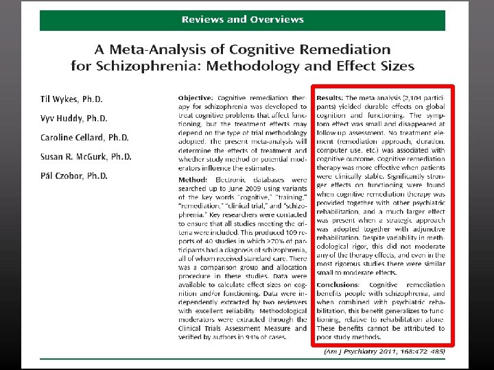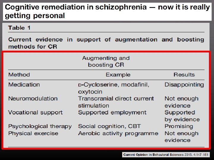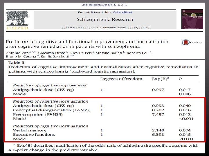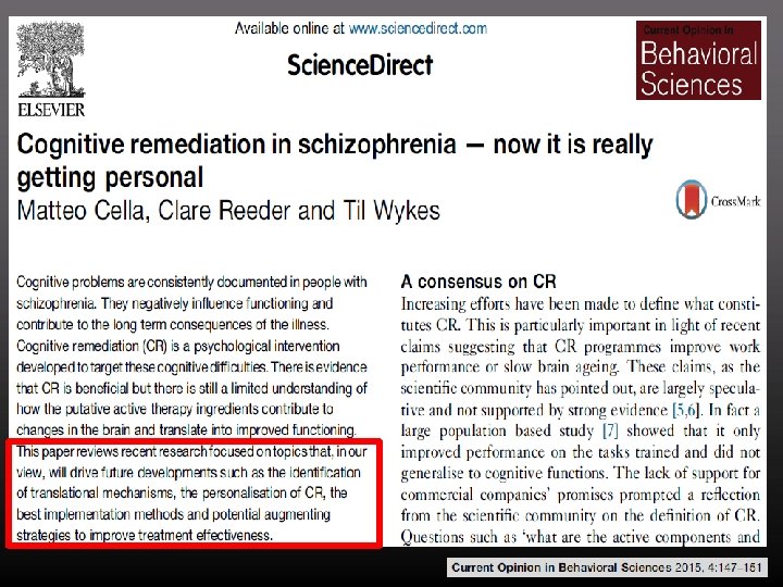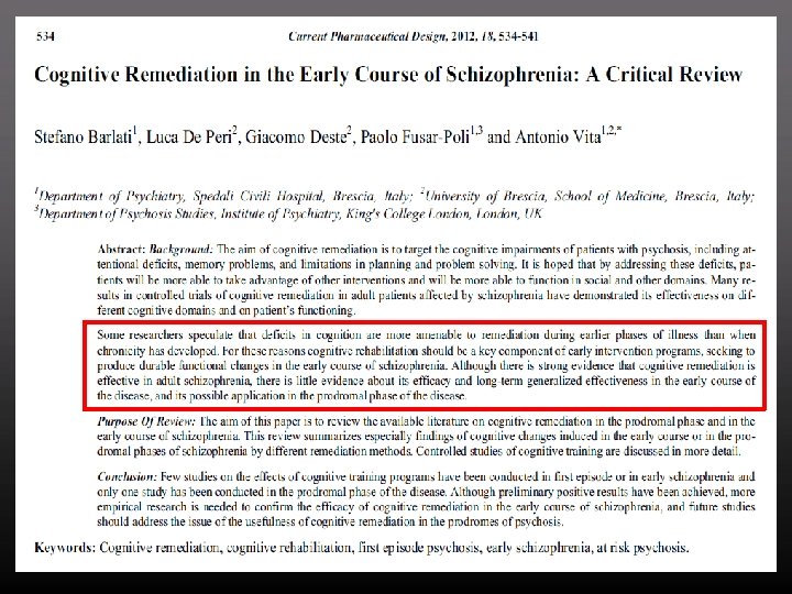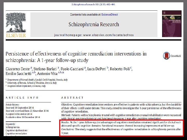 Cognitive remediation for schizophrenia has been recently defined as “a behavioural training based intervention that aims to improve cognitive processes (attention, memory, executive function, social cognition or metacognition) with the goal of durability and generalisation” Cognitive Remediation Experts Workshop (CREW), Florence, April 2010