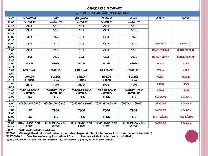 Plan hazırlanırken haftalık çizelgelere önce zorunlu faaliyetler (uyku, yemek, dershane, okul, diğer sosyal aktiviteler) işaretlenir. Kalan boş saatler ise ders çalışmak için düzenlenir. Planınızda bütün derslerinize yer vermelisiniz. Belirli derslere yer verip diğer dersleri ihmal etmek amacınıza ulaşmanızı engeller. Herkes için günde standart bir çalışma saati yoktur. HER ÖĞRENCİNİN ÇALIŞMA İHTİYACI FARKLIDIR. BU NEDENLE KENDİNİZE DÜRÜST OLUN!!!!! Çalışma planı hazırlarken saatler boyu hiç ara vermeden yada çok kısa aralarla sizi ders çalışmaya iten bir plan yapmaktan kaçınmalısınız. 45 dk. +10 dk. =60 dk. Ders çalışmadan en iyi bir şekilde verim alabilmek için ders seanslarının 45 dk'lık bölümlere ayrılması gerekir. 45 dk ders çalışmasından sonra 5 dk tekrar konunun anlaşılması açısından yararlıdır. Her çalışma seansından sonra 10 dk'lık dinlenme molası vermek doğru olur.
