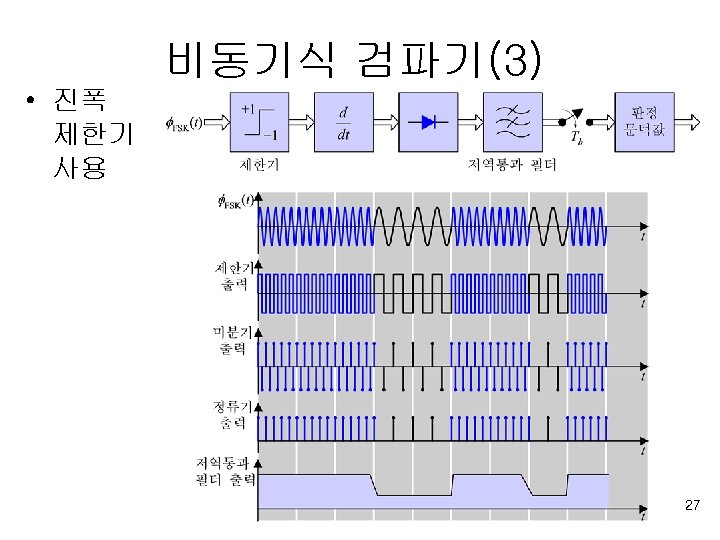 변조와 복조 방식 • 동기 검파 : 수신기가 신호를 검파하기 위해 반 송파의 위상 정보를 이용함. • 비동기 검파 : 검파시 위상 정보를 이용하지 않 음 동기 방식 : PSK , FSK, ASK, CPM, Hybrid 비동기 방식 : DPSK, FSK, ASK, CPM, Hybrid PSK : Phase Shift Keying DPSK : Differential PSK, FSK : Frequency Shift Keying ASK : Amplitude Shift Keying CPM : Continuous Phase Modulation 6