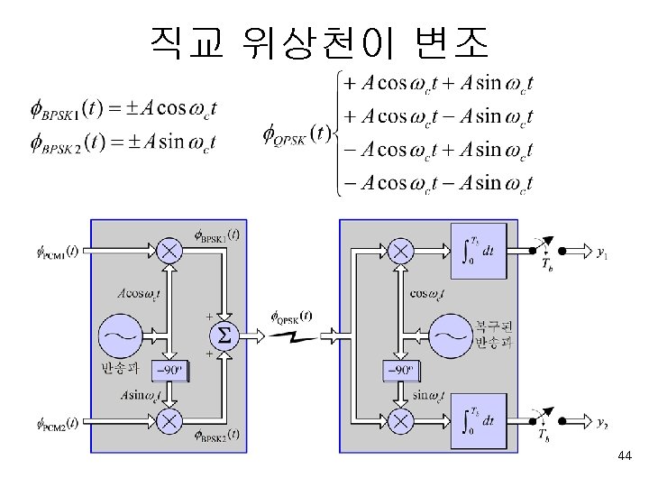 BPSK 동기검파 비트오율 Data Rate : 1 Mbps s 1(t) = Acos(w 0 t) , s 2(t)=-Acos(w 0 t) A=10 m. V N 0=10 -11 W/Hz Sol) 43