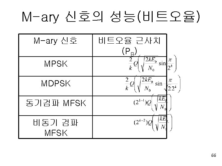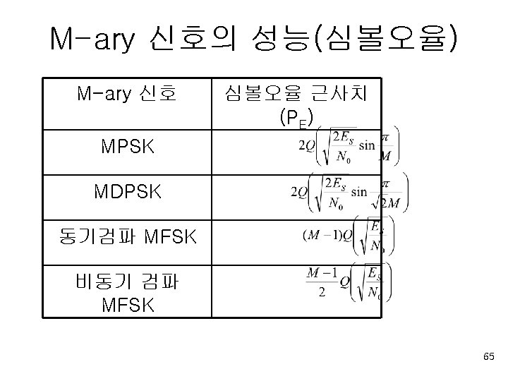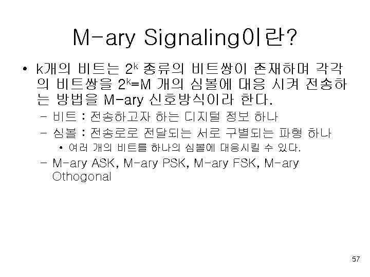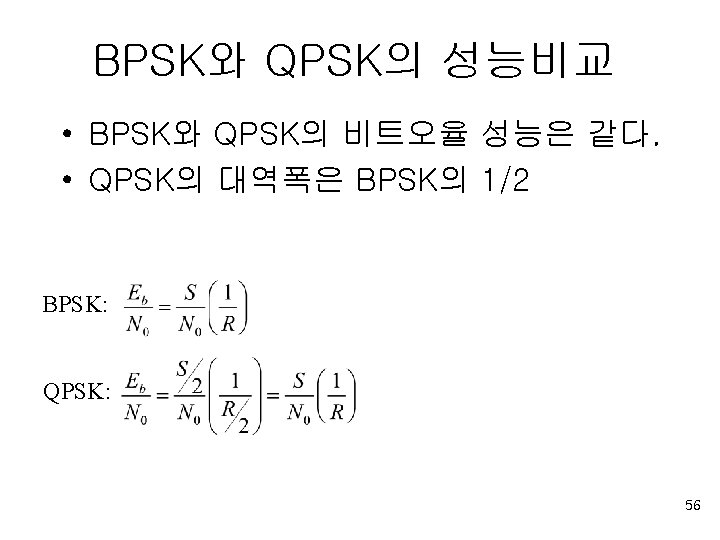 Binary Signaling 성능 비교 • PSK > FSK : 3 d. B • PSK > DPSK : 1 d. B • 동기 FSK > 비동기 PSK : 1 d. B 54