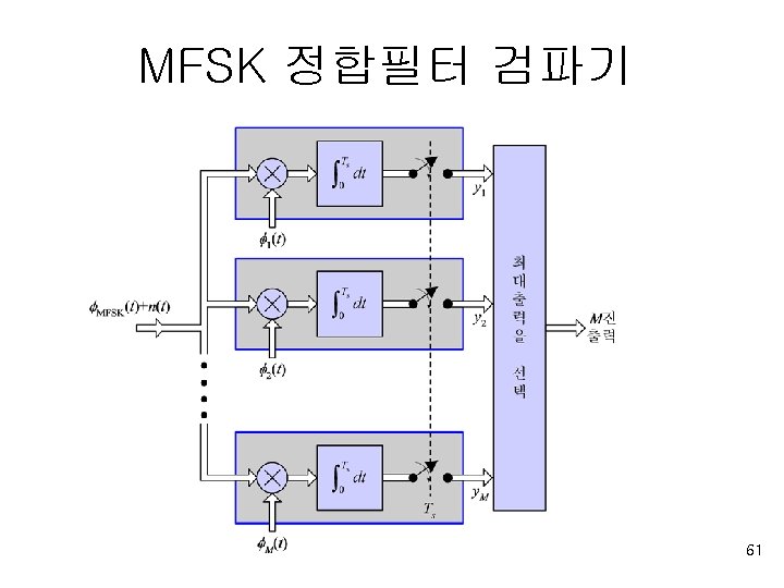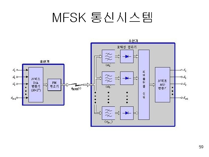 M-ary Signaling(MFSK) • M=2 일 경우 : BFSK : ={ 1 , 2} • M=4 일 경우 : QFSK : = { 1 , 2 , 3 , 4} • M=2 k 인 일반적인 경우 : MFSK 2 2 1 M=2 k=1 3 1 4 M=4 k=2 58