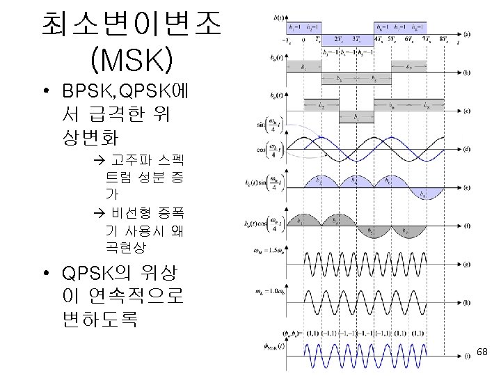 M-ary 신호의 성능 • MFSK : Multi-Frequency Shift Keying • MPSK : Multi-Phase Shift Keying k=1 k=10 k= Shannon limit M-ary FSK M-ary PSK 67