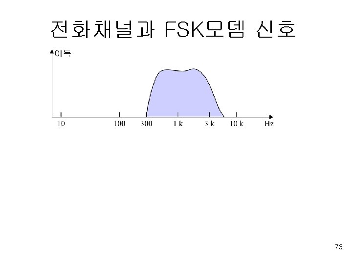 모뎀(MODEM) • • MODulator-DEModulator 비동기식(asynchronous) : 1800 bps 이하 동기식(synchronous) FSK 모뎀(1800 bps이하) MFSK 모뎀(2~5 kbps) QAM 모뎀(5 kbps 이상) TCM 모뎀(32 kbps 이상) 기타 : 케이블 모뎀/LAN모뎀/무선모뎀/셀 룰라폰 모뎀 72