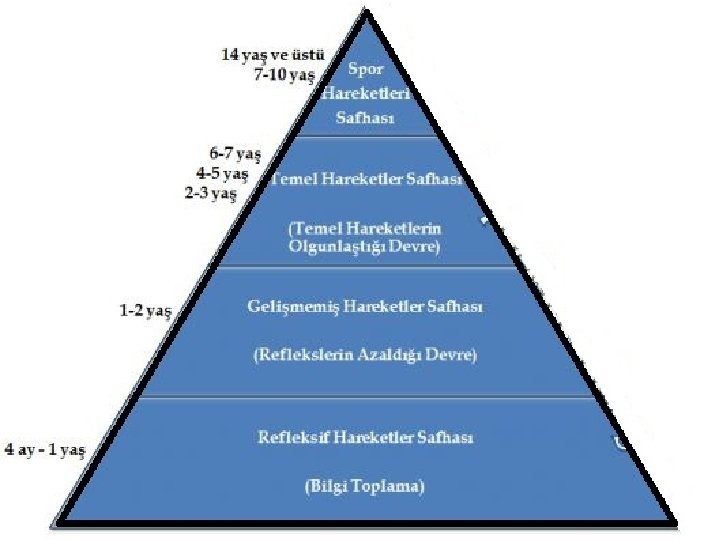 • Bu modele göre her bir motor gelişim dönemi, bir diğerinin üzerine kurulur. Piramidin temeli, refleksif hareketler dönemini göstermektedir. Bu dönemi, ilkel hareketler dönemi ve temel hareketler dönemi takip eder. Piramidin tepe noktasını spor hareketleri dönemi oluşturur