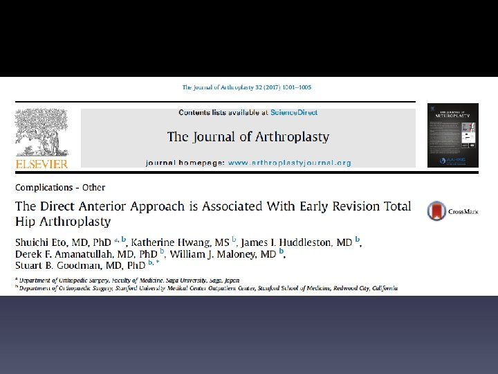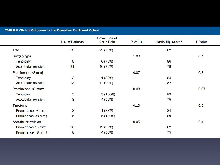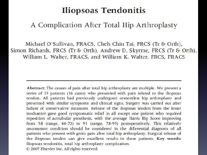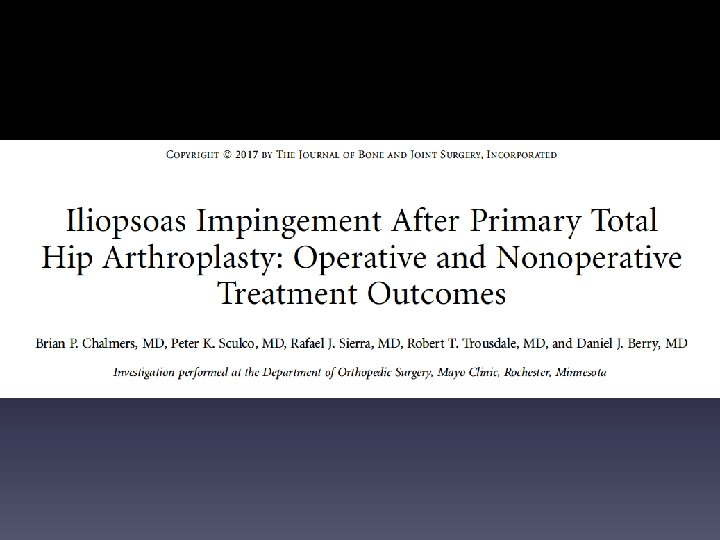 ANTERIOR OVERHANG>8 MM • Iliopsoas Impingement After Primary Total Hip Arthroplasty: Operative and Nonoperative Treatment Outcomes • • Chalmers, Brian P. ; Sculco, Peter K. ; Sierra, Rafael J. ; Trousdale, Robert T. ; Berry, Daniel J. Copyright © 2017 The Journal of Bone and Joint Surgery, Inc. All rights reserved • JBJS. 99(7): 557 -564, April 5, 2017. • doi: 10. 2106/JBJS. 16. 00244 8