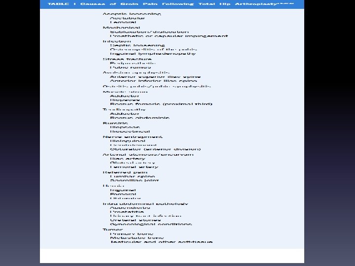 HISTORY • ANTERIOR GROIN PAIN UPON RISE FROM CHAIR OR STAIR CLIMB • USUALLY AFTER 6 -12 WEEKS POST OP