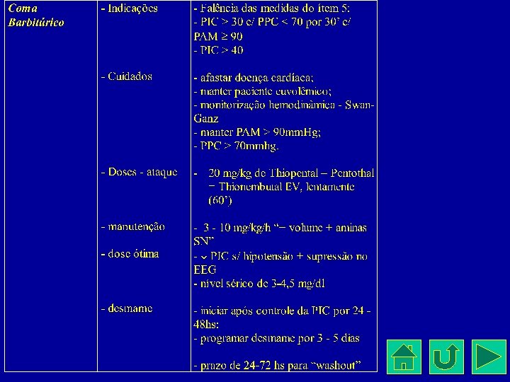 Ênfase terapêutica • PIC, manter PPC • Desidratação eletiva • Euvolemia • Terapia osmótica (rotina) • Terapia osmótica seletiva • Hiperventilação • Normocapnia – Pa. CO 2 < 30 mm. Hg – Sj. O 2 > 55% / ECO 2 < 42% • Barbitúrico (rotina) • Barbitúrico limitado • Corticoesteróide (rotina) • Sem corticoesteróide • Evitar sedação • Assegurar sedação/analgesia • Evitar PEEP • PEEP p/ Sa. O 2 • Anticonvulsivante rotina • Pós convulsão / lesão específica