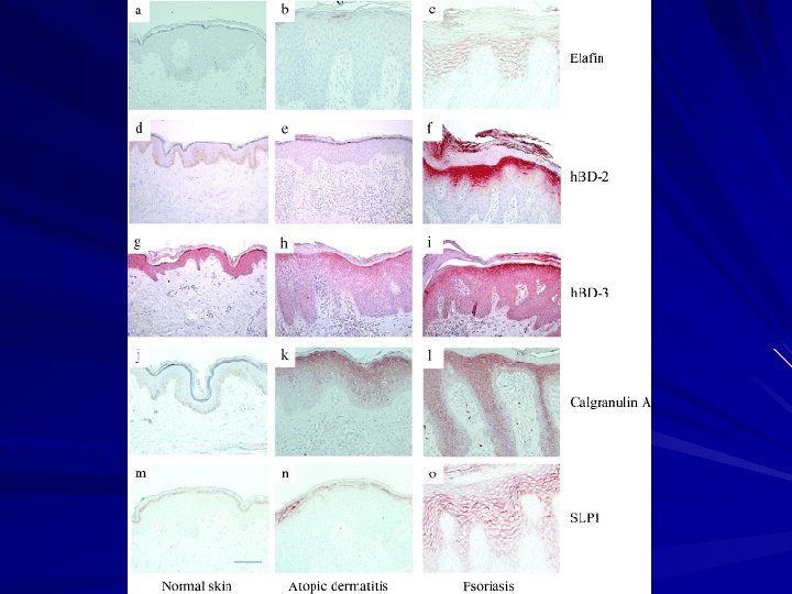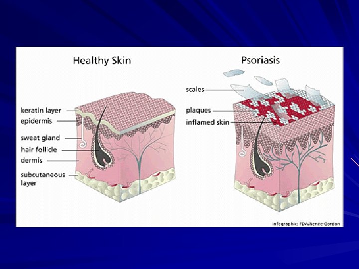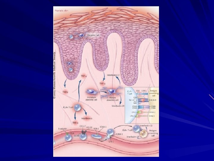 Psoriazis: etiologie, patogenie (factorul imun, fenotip keratinocitar psoriazic) Mulţi prezintă contribuţia celulelor T în producerea leziunilor cutanate psoriazice şi iau în discuţie receptorii caracteristici, factorii ereditari şi de mediu implicaţi în această boală. Răspunsul imun înnăscut se realizează prin intermediul unor subseturi de celule T, aşa numitele celule NK-T. Cercetările actuale susţin că ele reprezintă legătură între cele două tipuri de răspuns imun: înăscut şi dobândit, fiind demonstrată prezenţa lor în leziunile acute şi cronice de psoriazis. Keratinocitele plăcii psoriazice prezintă o rezistenţă la apoptoză crescută, comparativ cu cele din pielea normală, aceasta fiind conferită de expresia unor proteine antiapoptotice Bcl-x şi Bcl-2, remarcându-se ulterior că plăcile psoriazice conţin keratinocite cu abundenţă de Bcl-x, dar nu şi Bcl-2. în 1999 Chaturvedi V. şi colab. au arătat că IFN creşte nivelele de Bcl-x determinând apariţia unui fenotip keratinocitar specific psoriazic rezistent la apoptoză. + idei despre implicarea HVC, HIV, VVZ