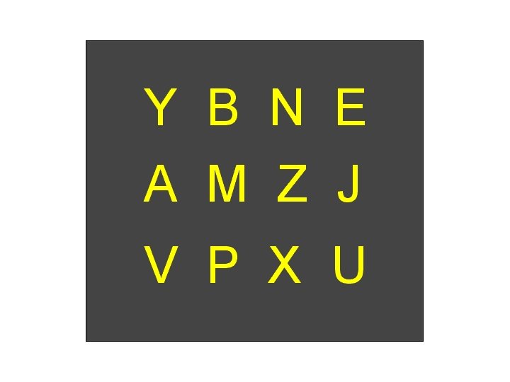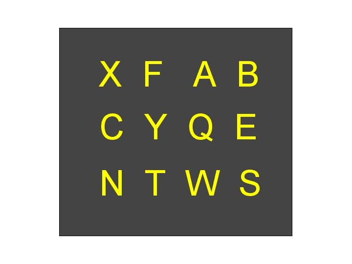 Partial Report I'm going to show you a bunch of letters, then I'll cue you (with a blue arrow) as to which row of letters I'd like you to recall. Immediately following the cue, write down as many letters as you can from that row.
