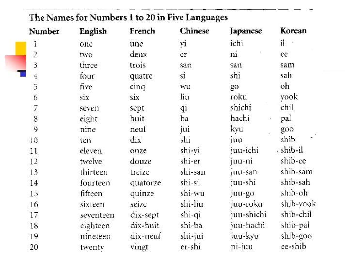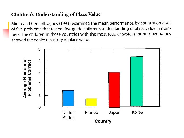 Counting & Arithmetic n n The greater regularity of number names in Chinese, Japanese and Korean as compared to English or French facilitates the learning of counting behavior beyond 10 in those languages. Another advantage is earlier mastery of ‘place value’ (understanding that in # 23 there are 2 tens and 3 ones)