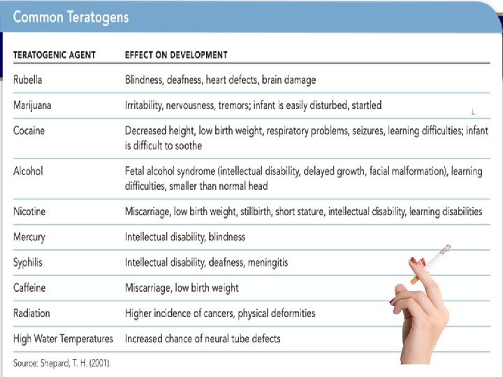 Influences • Prenatal development is mainly a function of the zygote’s genetic code (nature), but the environment (nurture) also plays a role • Teratogens are environmental agents (such as drugs or viruses), diseases (such as German measles), and physical conditions (such as malnutrition) that impair prenatal development and lead to birth defects or even death