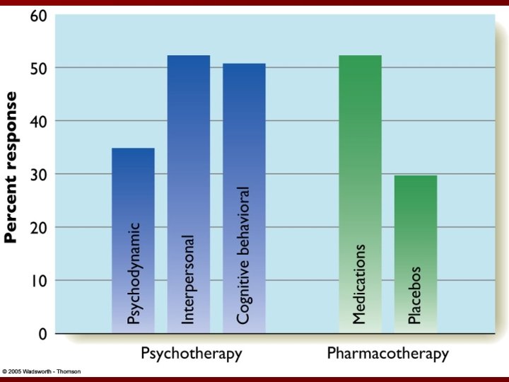 Treatment Success n Most treatments provide temporary success almost immediately. n Over the long run, success rates wane greatly. n Success rates are highly associated with the intensity of the symptoms pre-treatment, and the time between onset and treatment of the disorder. n The Rule of thirds for medication. – Acute and sudden onset: good response to medication – Middle: could be either sudden or acute, mixed response to medication – Chronic: slow, insidious onset, poor response to medication