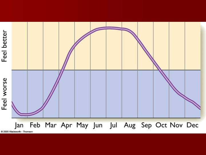 Seasonal Affective Disorder and Dysthymia n Seasonal Affective Disorder – – Associated with the change of seasons Symptoms are similar to those of depression, but to a milder extent Light therapy is a popular treatment for this disorder Prevalence of disorder depends upon location § approx 1% of Floridians § Approx 9 -10% of Minnesotans – 49, 18 n Dysthymia – – Symptoms are similar to those of depression. Much less severe symptoms Lasts much longer than depression (2 years before diagnosis) Not considered traumatic at any given time, but can be very debilitating through its long-term effects – 29, 33