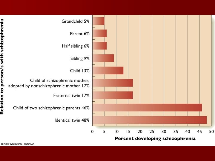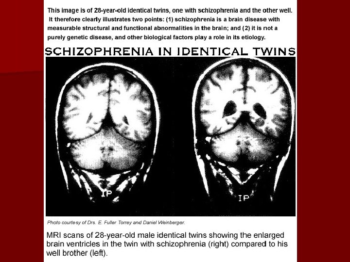 Theorized Causes n Genetic n Brain abnormality/malformation n The neurodevelopmental hypothesis – Twin studies suggest a genetic component in susceptibility for schizophrenia – No single gene has been linked to schizophrenia – the hippocampus and parts of the cerebral cortex are a little smaller than normal, the cerebral ventricles are larger than normal, the neurons are smaller there are fewer synapses in the prefrontal cortex. – Is this a causal or correlational relationship? – schizophrenia is the result of nervous system impairments that develop before and/or around the time of birth. – Caused partially though genetics, but also through environmental influences: § § § poor prenatal care difficult pregnancy and labor mother’s exposure to influenza virus.