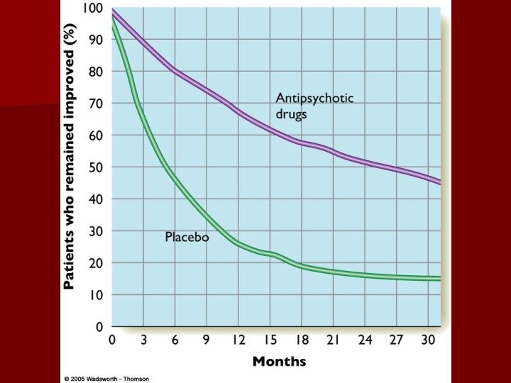 Treatments n Medication: Antipsychotic or neuroleptic drugs. n Hospitalization: useful for only acute episodes. n Cognitive Behavioral Therapy (CBT): – These all relieve symptoms for at least a little while. – Some block dopamine synapses in the brain, others effect glutamate concentration. – Most in the past produced unpleasant side effects: tardive dyskenesia. – Hallucinations: help patients perceive distinctions between internal/external – Delusions: treat self-esteem or other psychological issues – Flat affect: increase social skills – Anhedonia: increase activities.